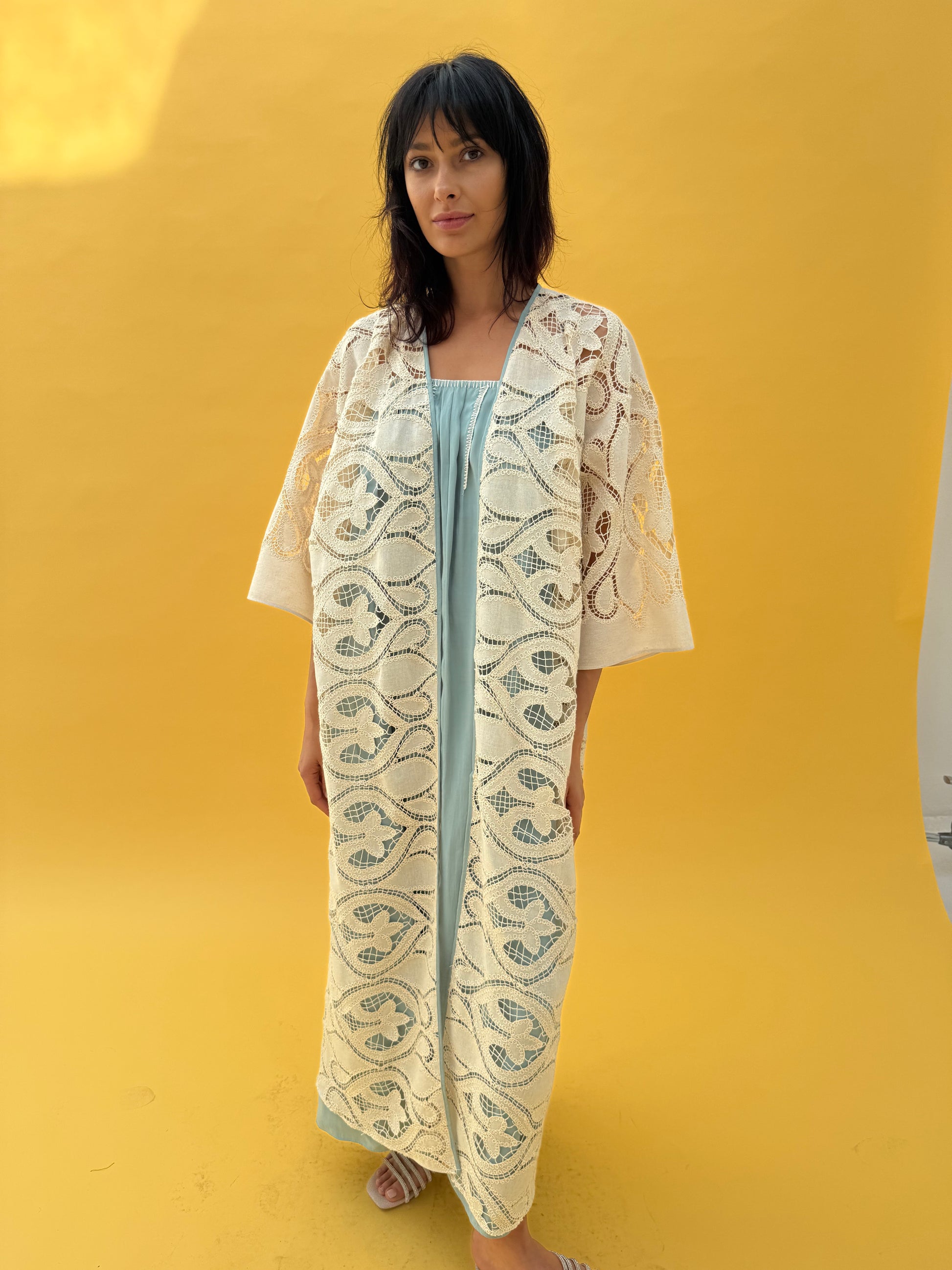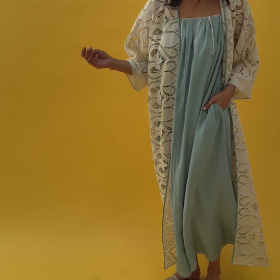 Crochet Abaya set with blue inner dress - Beige