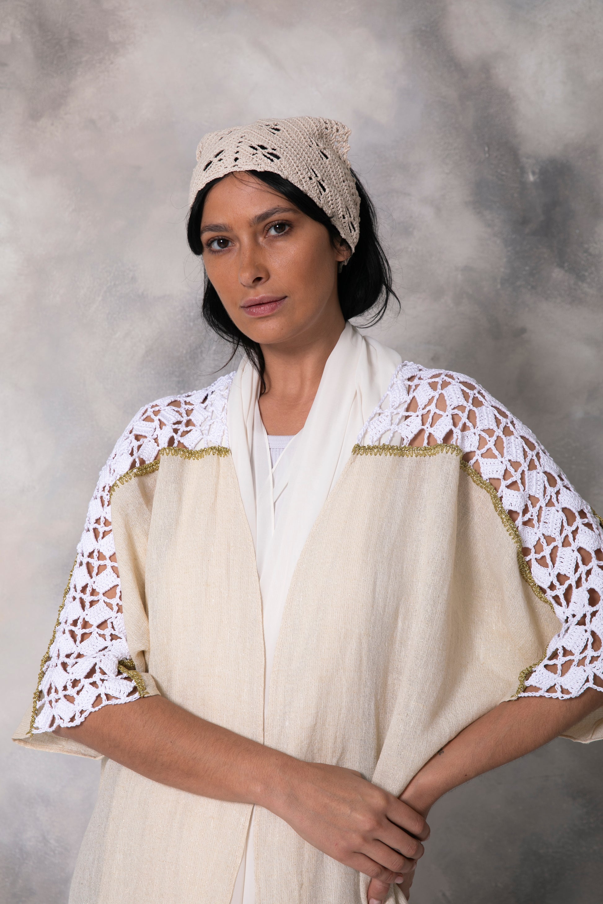 Linen gold shimmer abaya with handmade crochet
