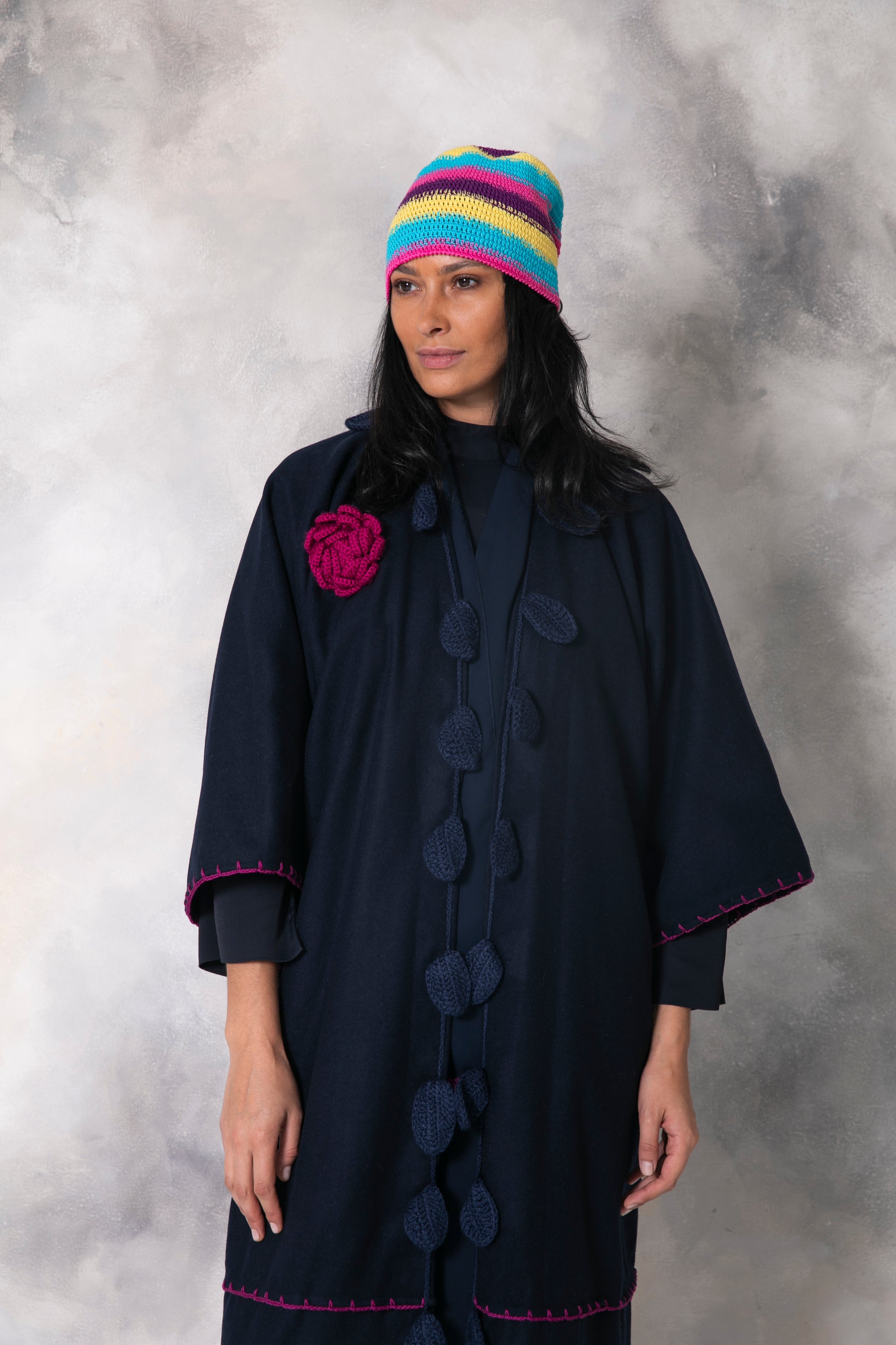 Navy Blue wool coat with handmade crochet leaves and flower